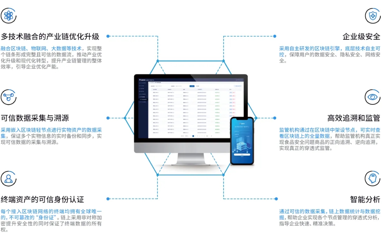 解決問題:軟硬結合從數據源頭實現上鏈,實時采集和上傳商品生產、倉儲出入庫、運輸、位置、銷售等各環(huán)節(jié)數據,并且使用區(qū)塊鏈的不可篡改性、可追溯性等技術特點,將實物商品流轉各環(huán)節(jié)信息在區(qū)塊鏈上進行數據存儲,實現了對實物商品的全程跟蹤、精準溯源。